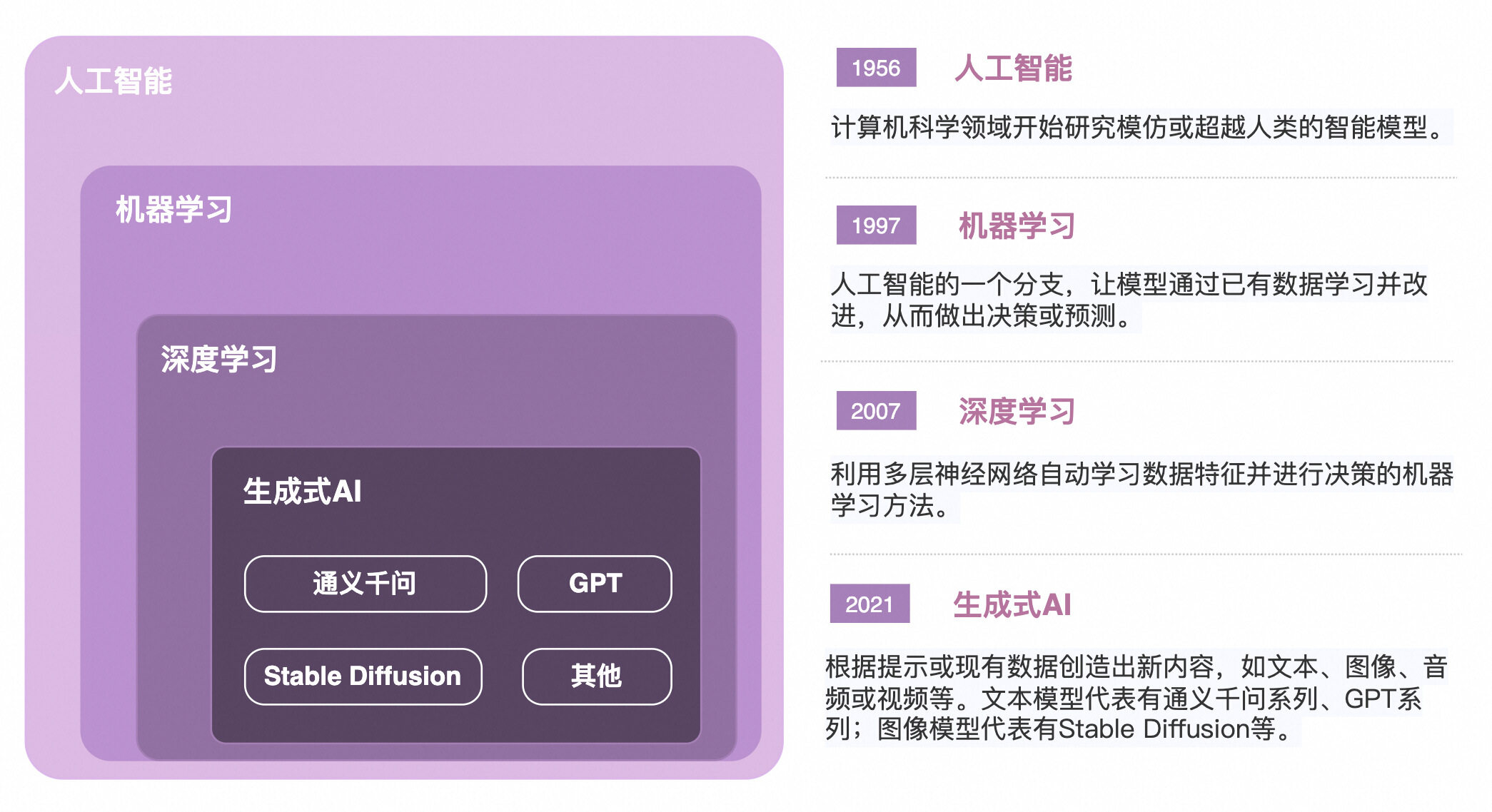 近几十年来,人工智能经历了从基础算法到生成式AI的深刻演变。生成式AI通过学习大量数据可以创造出全新的内容,如文本、图像、音频和视频,这极大地推动了AI技术的广泛应用。常见的应用场景包括智能问答(如千问、GPT)、创意作画(如Stable Diffusion)以及代码生成(如灵码)等,涵盖了各个领域,让AI触手可及。