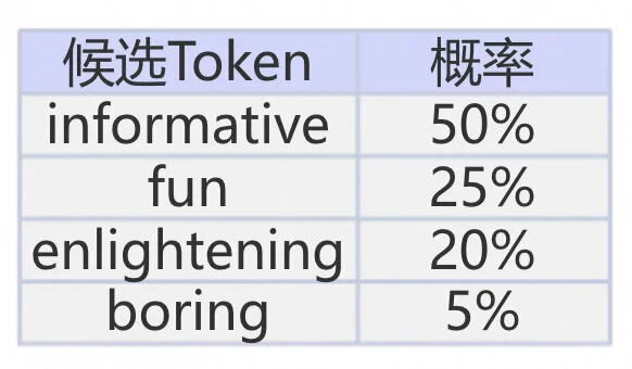 例如,下图展示了模型预测出的部分候选 token 及其概率(实际词汇表远比这大得多):